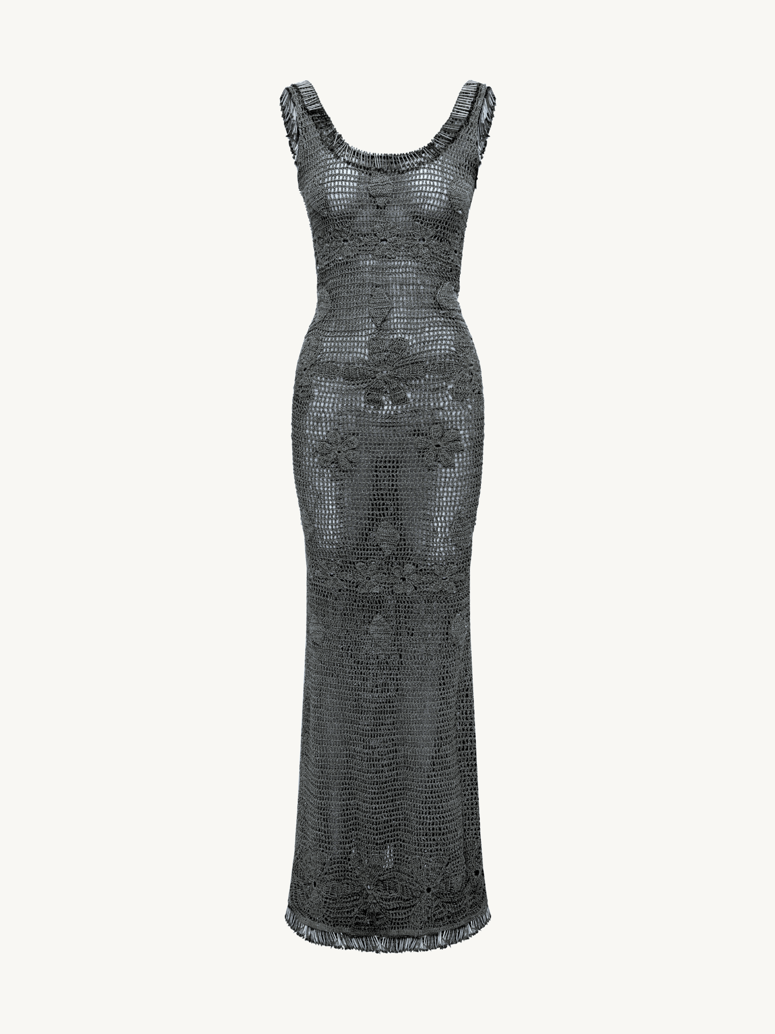 This form-fitting maxi drapes softly over the body, designed to move effortlessly with you. Delicate straps and a subtle scoop neckline frame the décolletage, while the daring low back adds an unexpected, sensual twist. The open hand-crochet construction creates a sheer, second-skin effect, and a straight hem with subtle beaded accents completes the look - balancing fluidity with refined structure for an effortlessly striking silhouette.