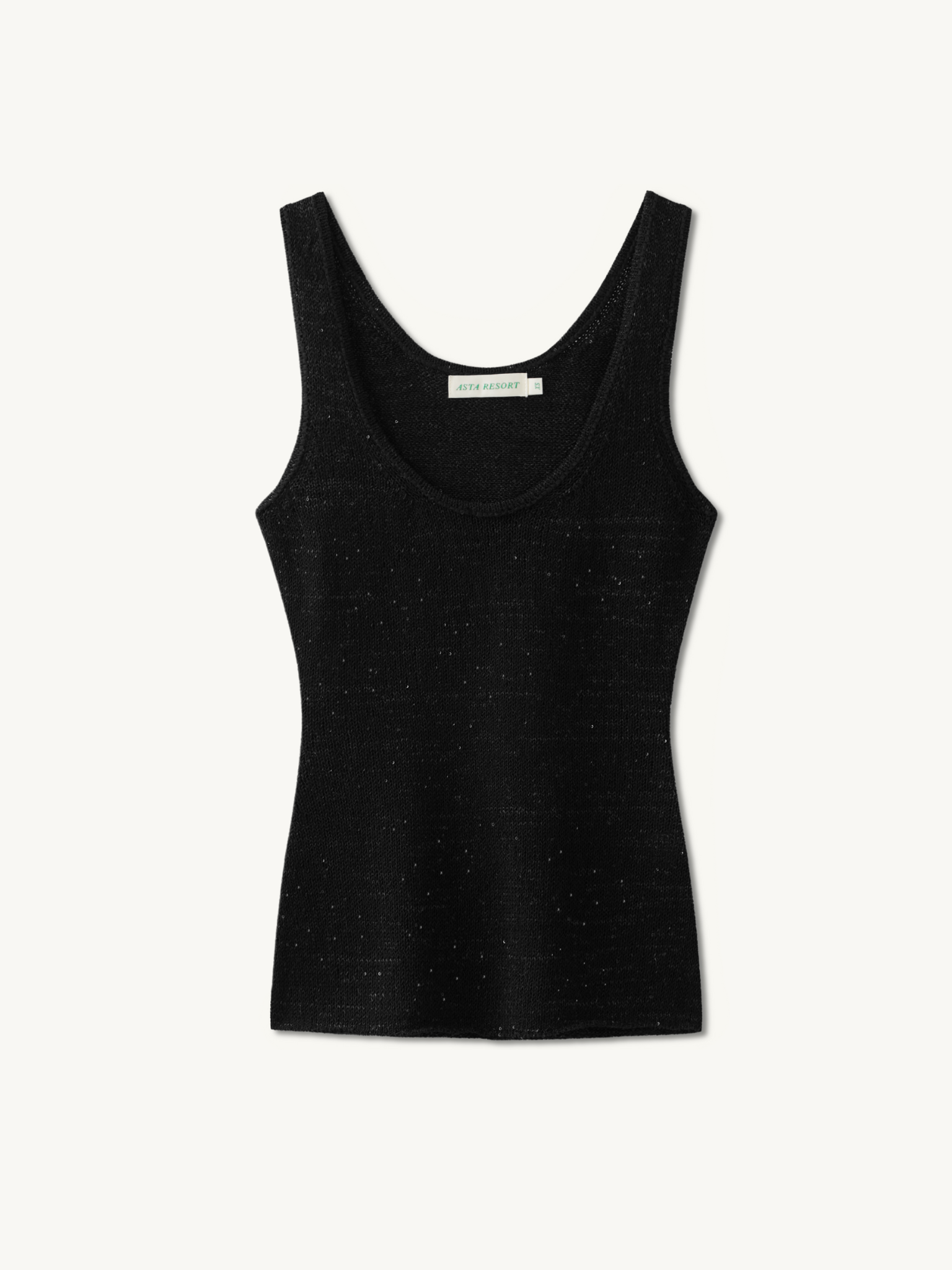 The Ana Top in Black Sequin by ASTA RESORT. Close fitting with a U-shaped scooped neckline to showcase the décolletage. Tags sewn into side seam, can be worn reversed for a higher neckline.