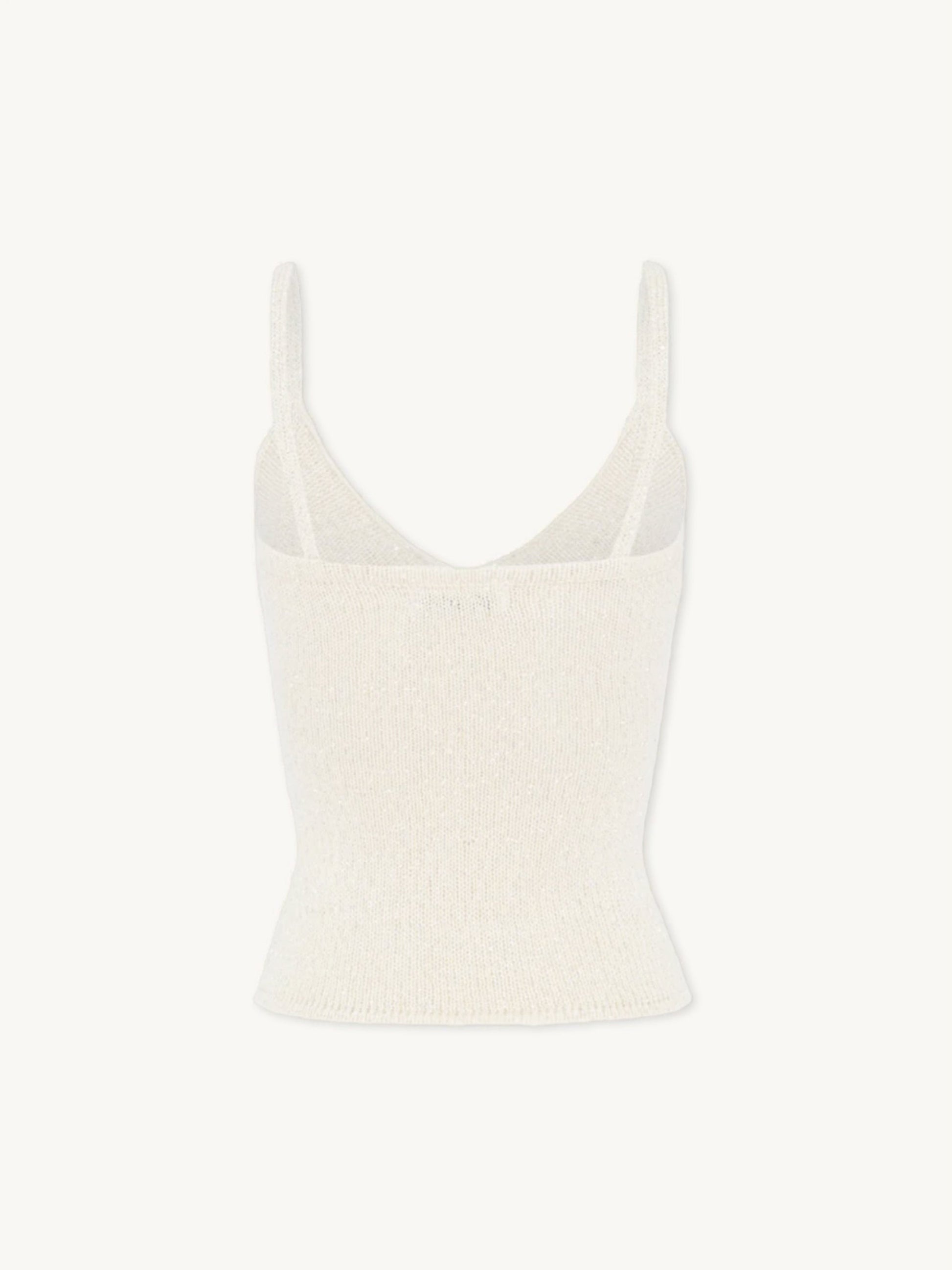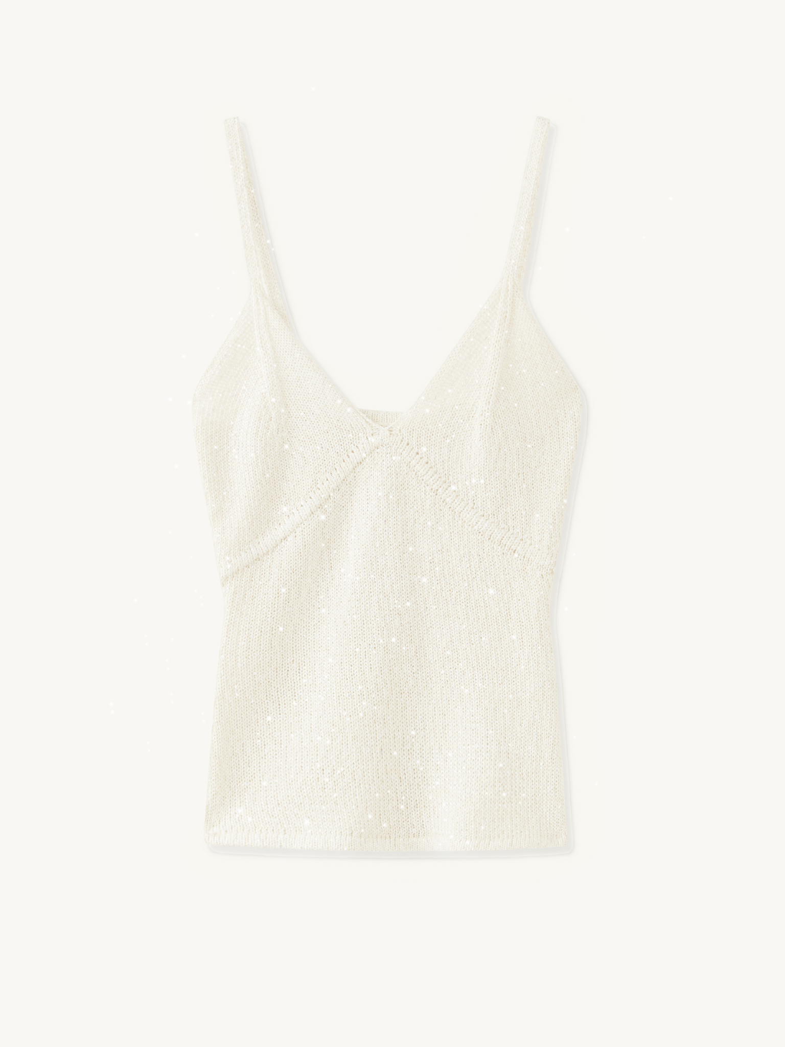 A scintillating thin-strap camisole with a V neckline, knitted from a our signature cotton-based, sparkling Italian yarn with micro-sequins throughout.