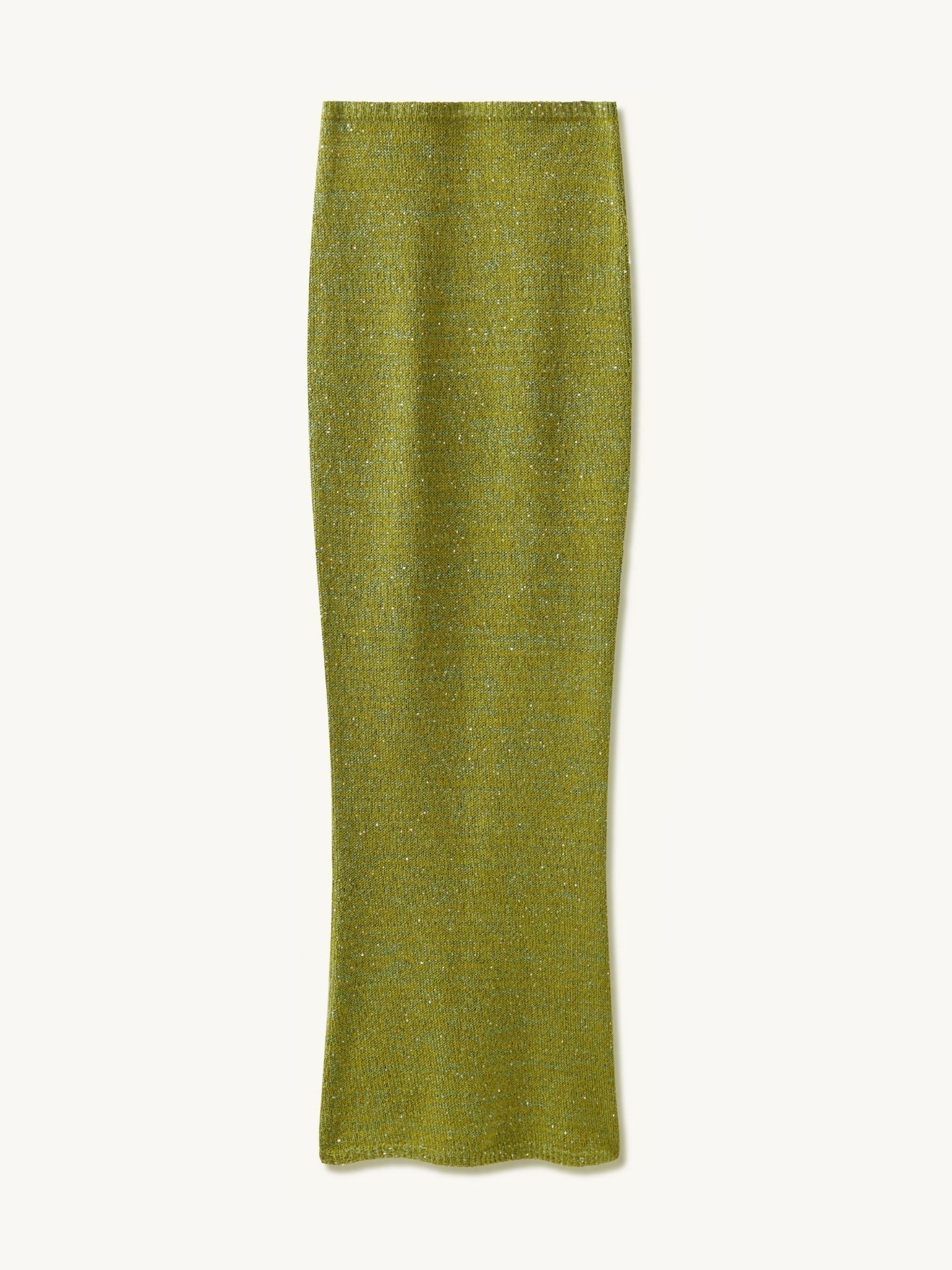A scintillating floor length skirt made from a luxurious cotton-based knit with micro sequins woven throughout. Semi-sheer.