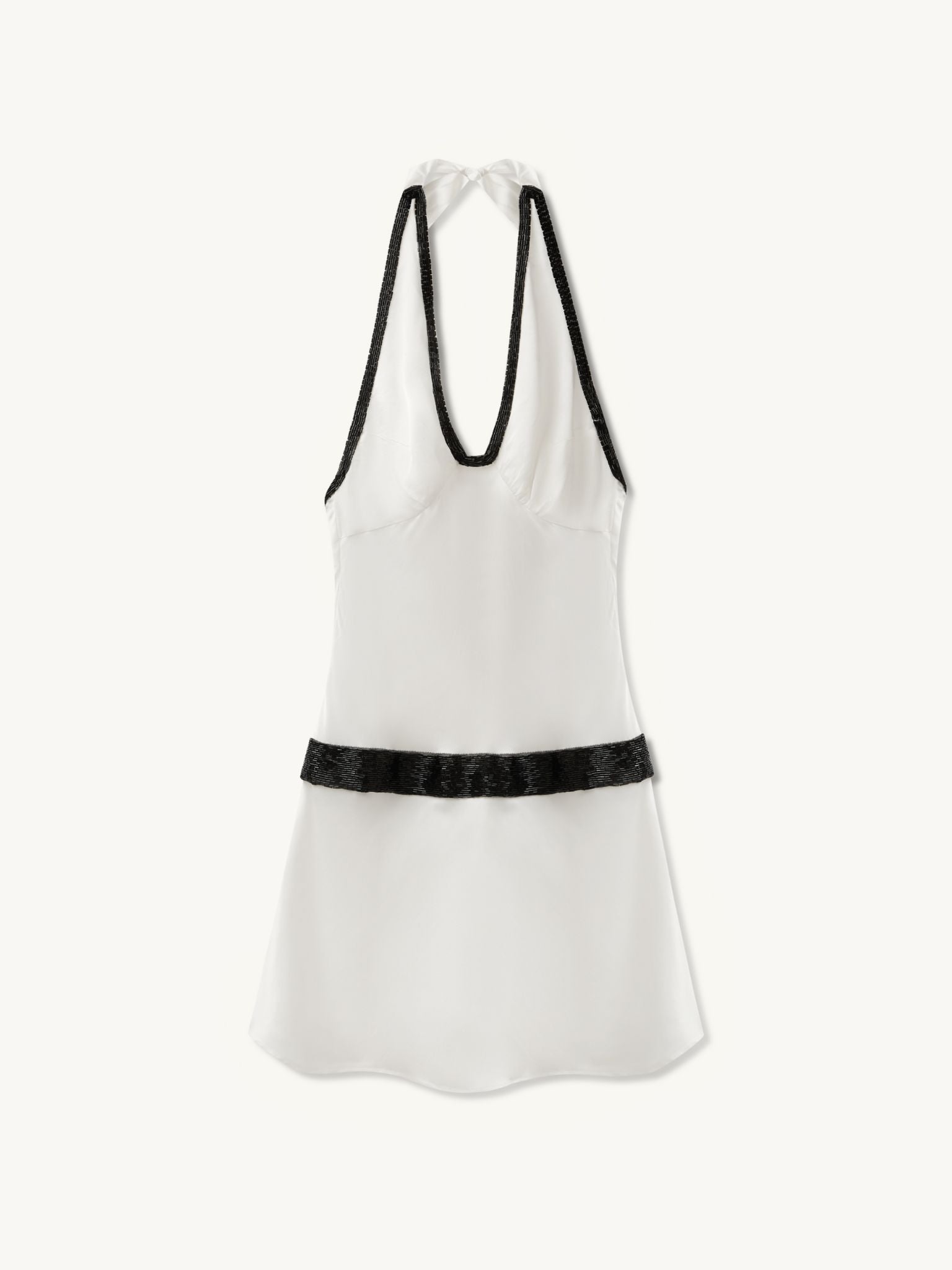 Hand-beaded trims of glittering-jet black embroidery frame the vintage-inspired halter mini dress cut in salt coloured silk-blend fabric as part of the "Piscina in Puglia" ready to wear collection.
