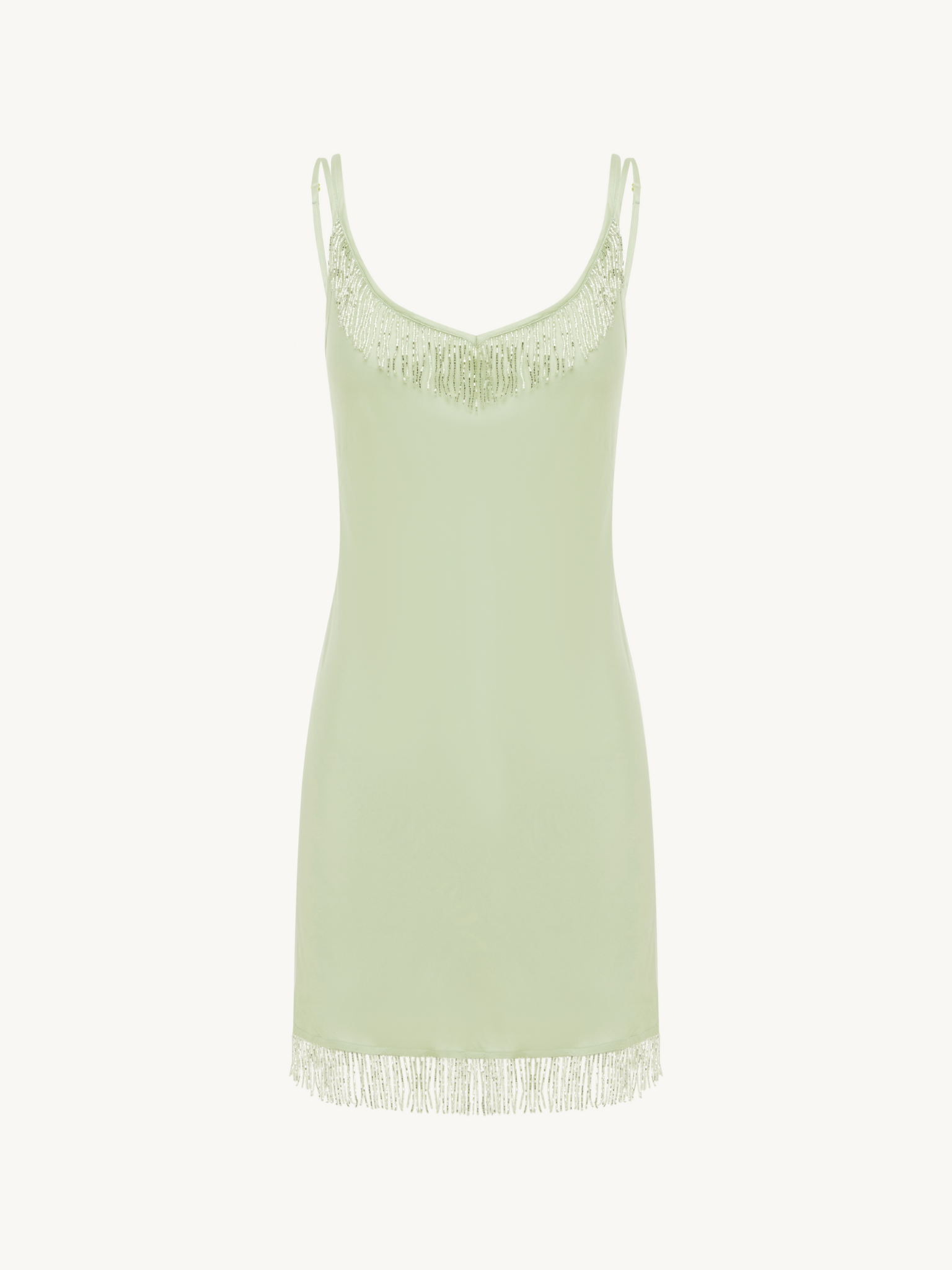 Designed to captivate with subtle drama, this slip dress is your new statement piece. Rendered in a soft light-sage hue, it glides beautifully over the body with a smooth, satin-like finish. Delicate bead fringe trims the neckline and hem, adding elegant movement and eye-catching shimmer with every step. Slim, adjustable straps and a streamlined silhouette make it effortlessly flattering and endlessly versatile - perfect for evenings out, celebrations, or any moment that calls for a little sparkle.