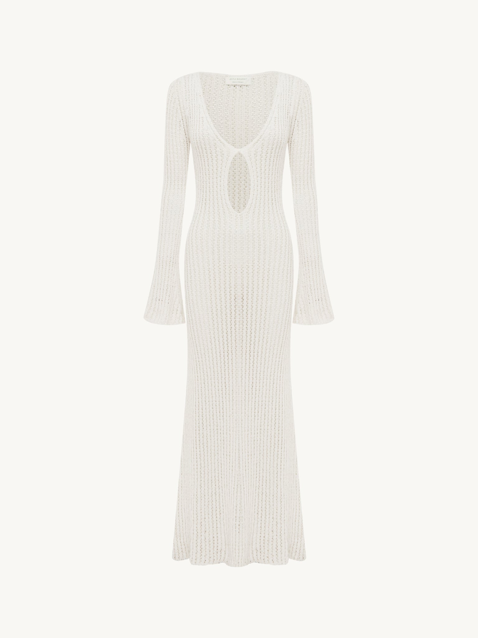 Crafted from a delicate open-weave rib knit that skims the body with a fluid, body-conscious drape. Designed with a deep neckline and soft keyhole detail at the bust, the silhouette frames the décolletage before falling into a full-length, columnar shape.