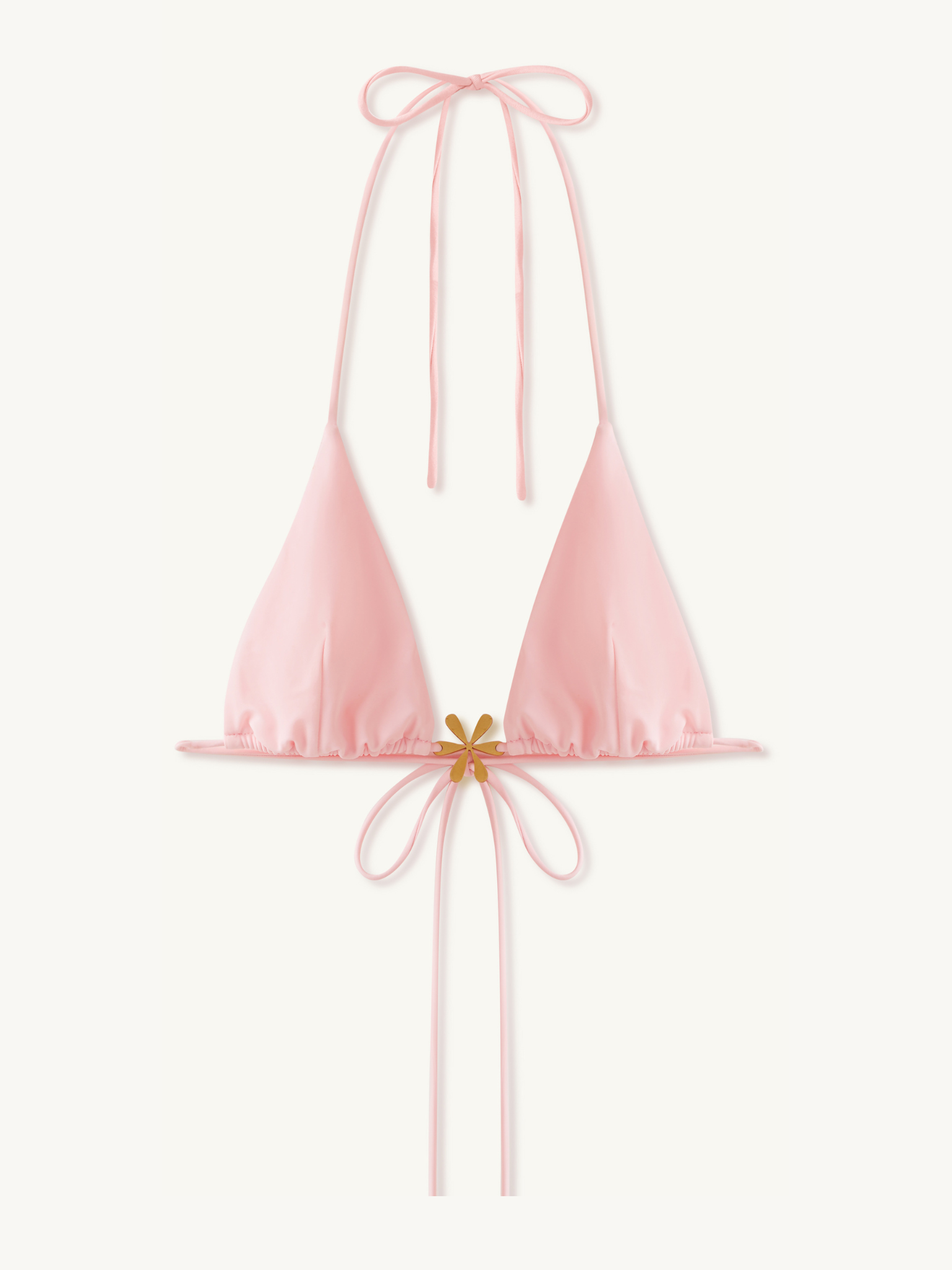 The Juliana Bikini Top in Rose Pink. A classic string triangle cut, adorned with brushed gold hardware featuring ASTA RESORT's signature Delilah motif, brings an elevated look to a staple style—perfect for your next holiday.