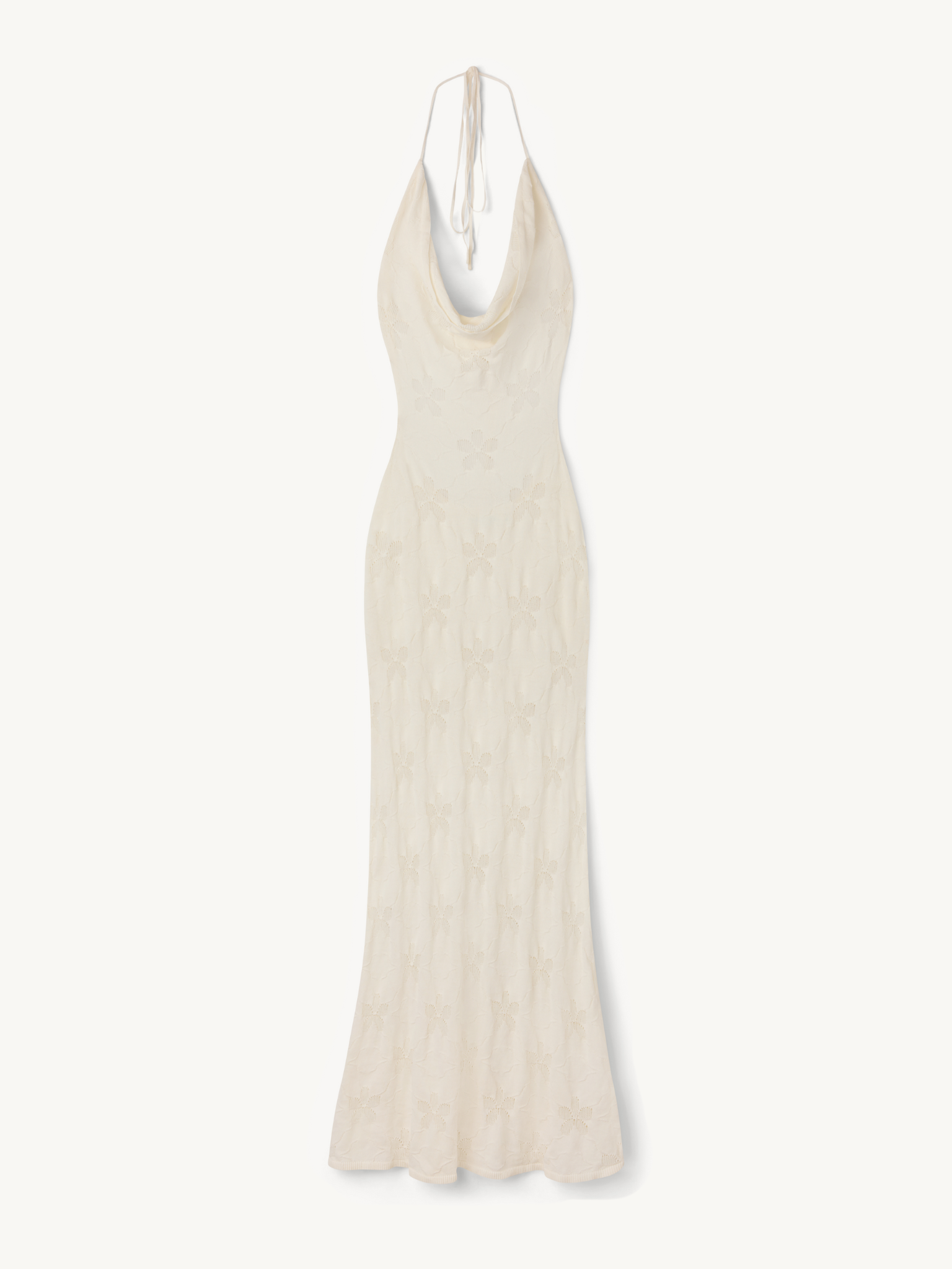 A backless floor-length silhouette with narrow back ties for elevated simplicity. Featuring a re-invented design to our signature flower pointelle motif.