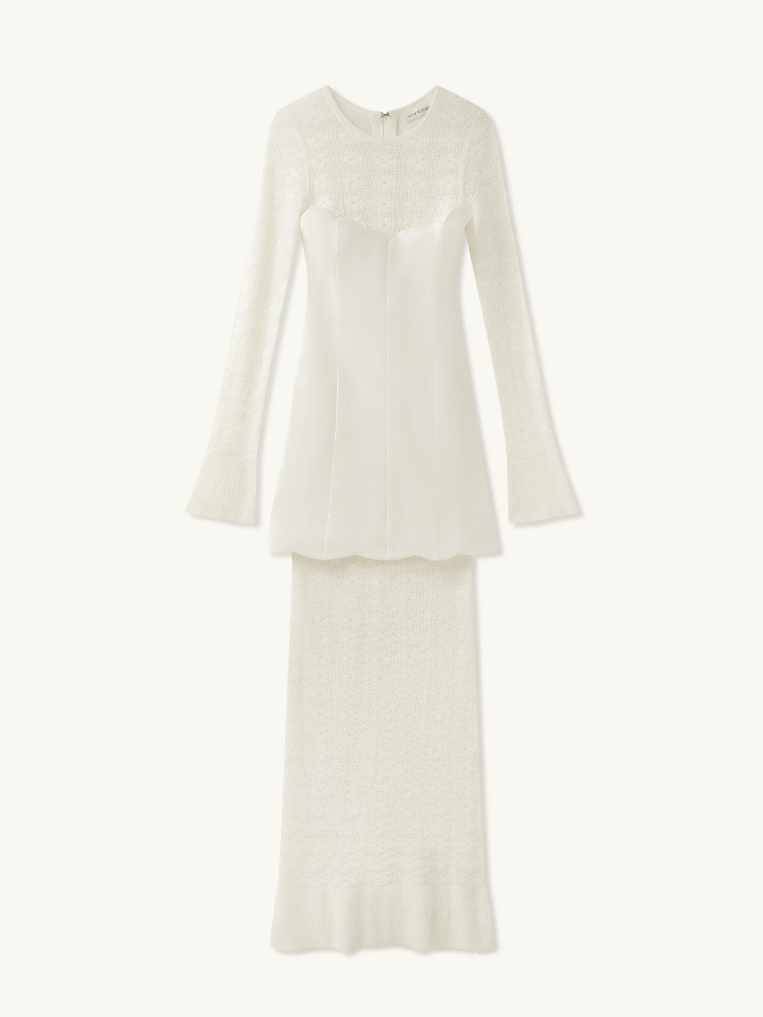Featuring a removable silk corset, wear it alone for a sleek look or pair it with the pointelle long sleeve knit underlay for added sophistication. The delicate lace detailing and scalloped edge create a flattering silhouette, while the luxurious silk provides a soft sheen.