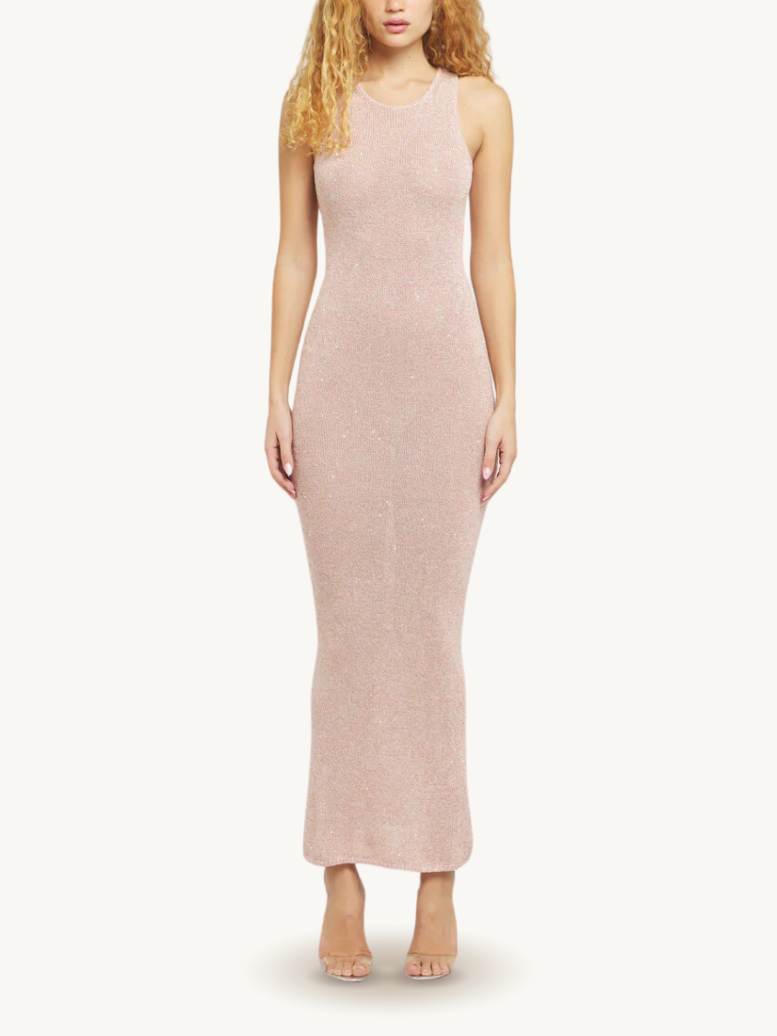 The Natalia Dress in Blush Sequin by ASTA RESORT. An opulent floor length dress designed to be the centre of attention and flaunting your figure. Made from a lustrous cotton-based knit woven in with micro sequins from head to toe.