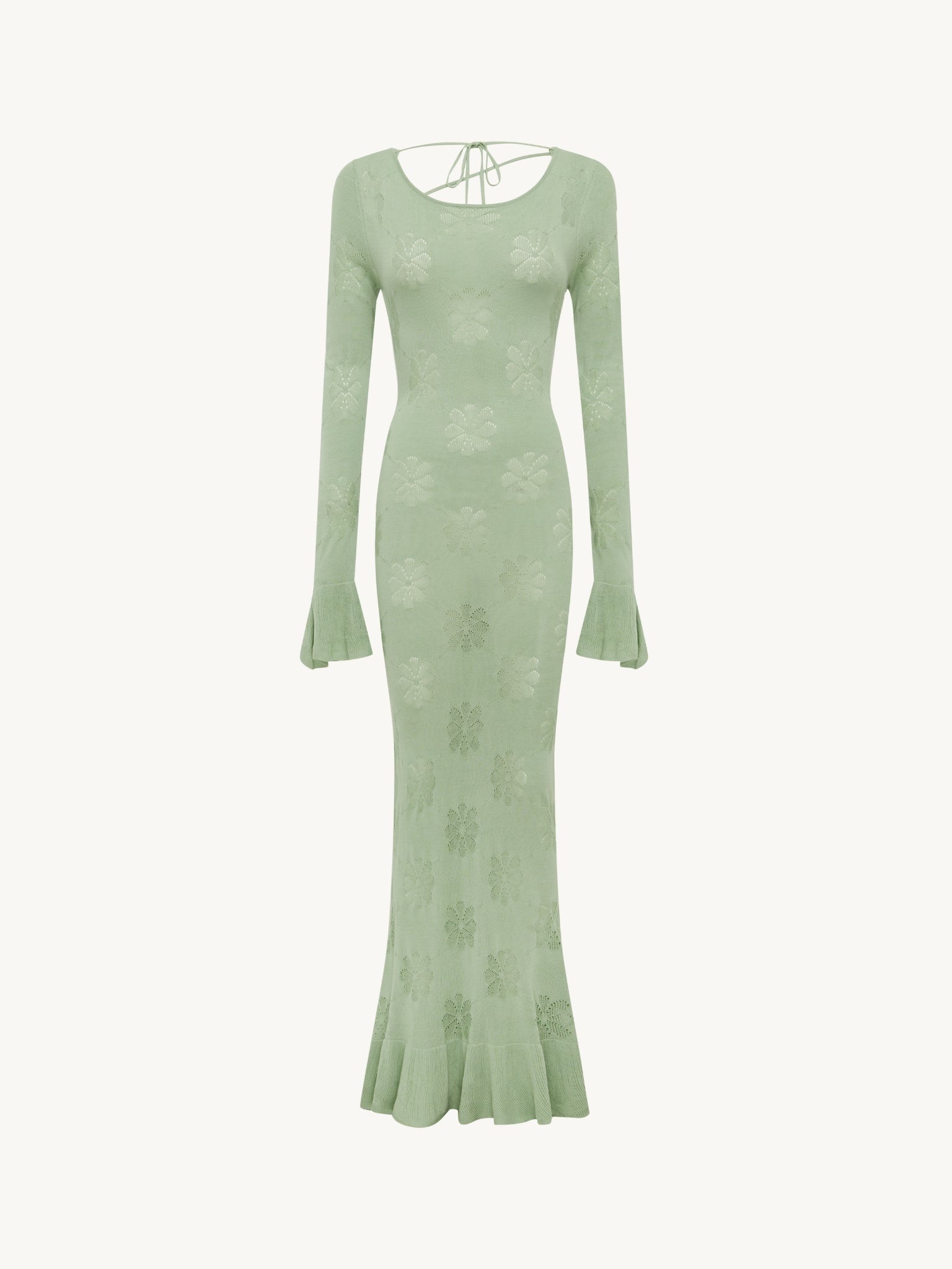 Reintroducing a loved silhouette. The Rafaella Dress, now reimagined in a serene Seafoam Green. Inspired by Venetian lace, its delicate pointelle motifs, fluted sleeves, and lace-up back trace the poetry of slow-paced days and moonlit nights.